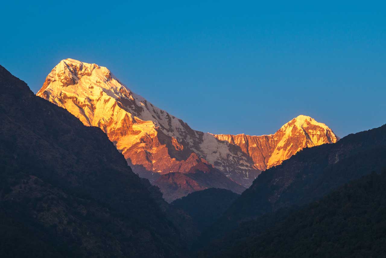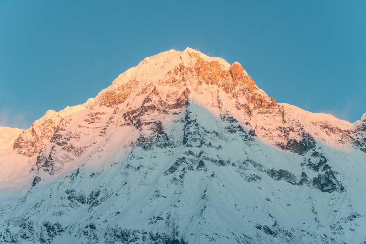 The Himalayas with Annapurna South and Machapuchare dominate the